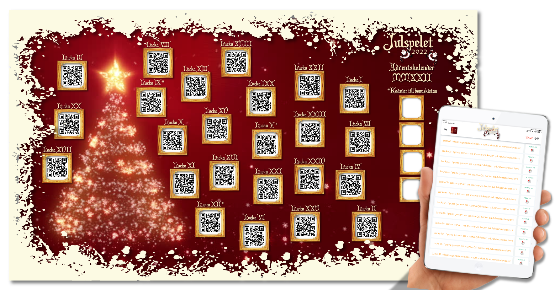 Varje lag får en tryckt kalender med 24 luckor/QR-koder. Scanna, tävla och utmana varandra under julmiddagen. Enkelt, smidigt och garanterat roligt vid bordet!